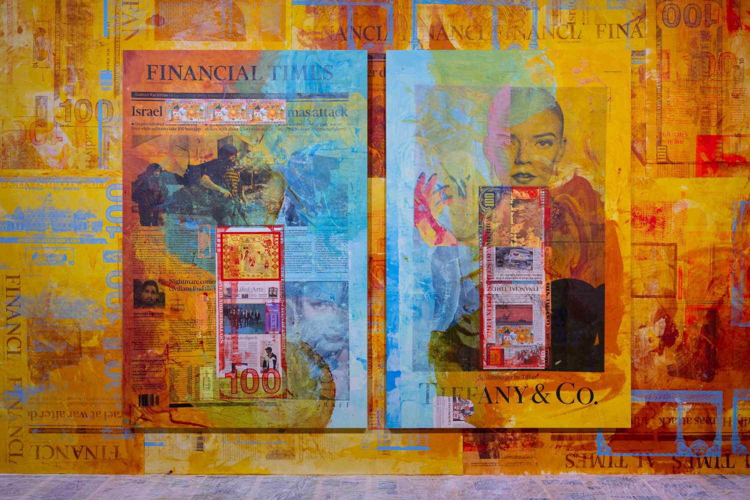 But I can’t imagine El-Sayegh’s vision being that simplistic. And indeed, it isn’t. The exhibition’s title, “Figure, Field, Grid,” refers to Rosalind Krauss’s concept of the “expanded field,” in which the “figure” is seen as the starting point of abstraction and the “grid” as its definitive endpoint. El-Sayegh challenges this concept by using the grid as a canvas for non-abstract figures. To put it plainly, the figures that feature in El-Sayegh’s show are anything but abstract: they show the human body in extremely opposing levels of distress, from the doll-like pose that Anya Taylor-Joy strikes for Tiffany & Co. to, further down in the show, pictures of IDF soldiers torturing Palestinians in prison. El-Sayegh took these images from various British newspapers and put them together in a neat, repetitive collage on the gallery walls—the show’s titular grid. Shown this way, the advertisements and the harrowing images of the genocide in Gaza appear to merge into one, a single skin rather than two separate ones. In certain presentations this combination could’ve been too jarring to metabolize (or worse: too didactic), but the installation is laid out in such a way that the viewer only gradually discovers the more viscerally violent images in the show. This isn’t to say that El-Sayegh tiptoes around her subject matter in an anodyne way, but rather, that she allows the viewer to discover what her work is about at their own pace—even if this means they have to spend a longer time with the work to feel what it’s doing. Let me just say that my initial reading of the show (“let’s show the people that The Media are in on it!”) was wrong.
