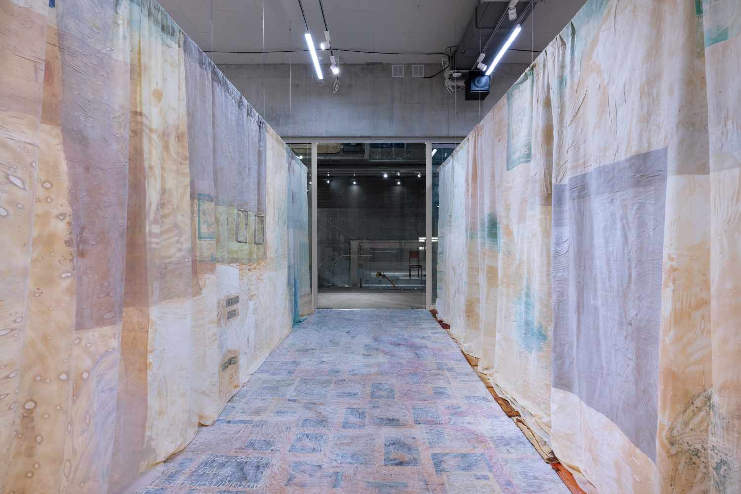 For “Figure, Field, Grid,” El-Sayegh used the entire gallery space on the Depot’s third floor as a canvas. The floor is covered in latex panels, many of them doused in red paint, and similar, albeit much larger panels dangle from the ceiling, effectively functioning as room dividers. I initially feel a sense of thrill upon entering the gallery, as if I’m passing into a different world. But once beyond the latex panels, in the main area of the exhibition, I can’t help but feel underwhelmed. The walls of the space are covered in, alternatively, newspaper clippings with incendiary headlines and advertisements for high-end jewelers like Mikimoto and Tiffany’s. Hey, I already know this world! And the (apparent) juxtaposition between reports of suffering and images of supreme wealth strikes me as obvious. Money, media and violence: sure! They’re all connected. What else is new?