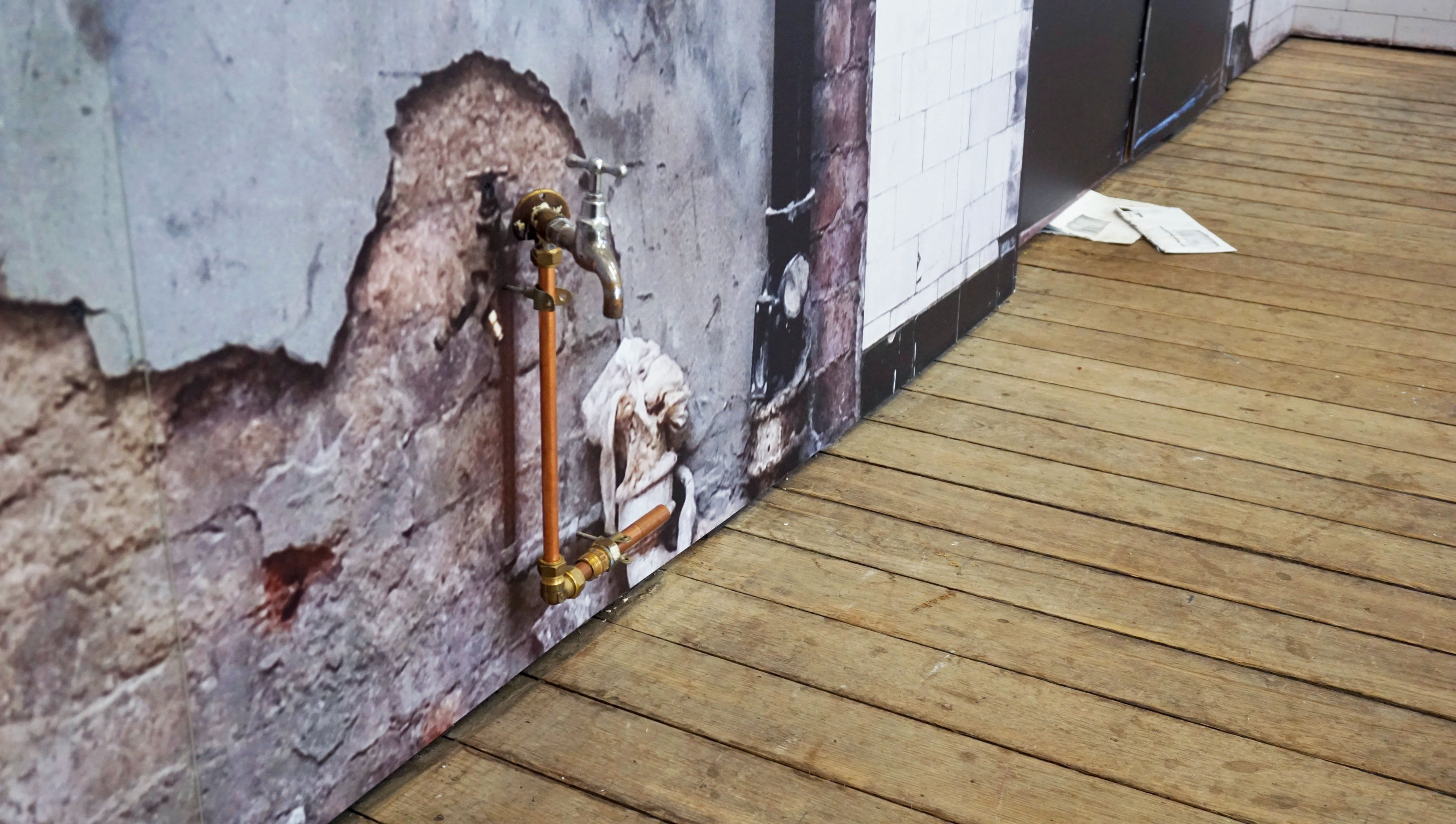 To create the simulacrum the artist duo Topp & Dubio scavenged the internet for photographs of the interior of the Aird’s Lane Bricks Space. They then stretched, shortened, patched them up with grafts of brick skin and printed them life-size to cover the walls of a space they had 24/7 access to: the host, a project space under the name “… ism”, which happens to also be a sort of antechamber to Topp’s house.