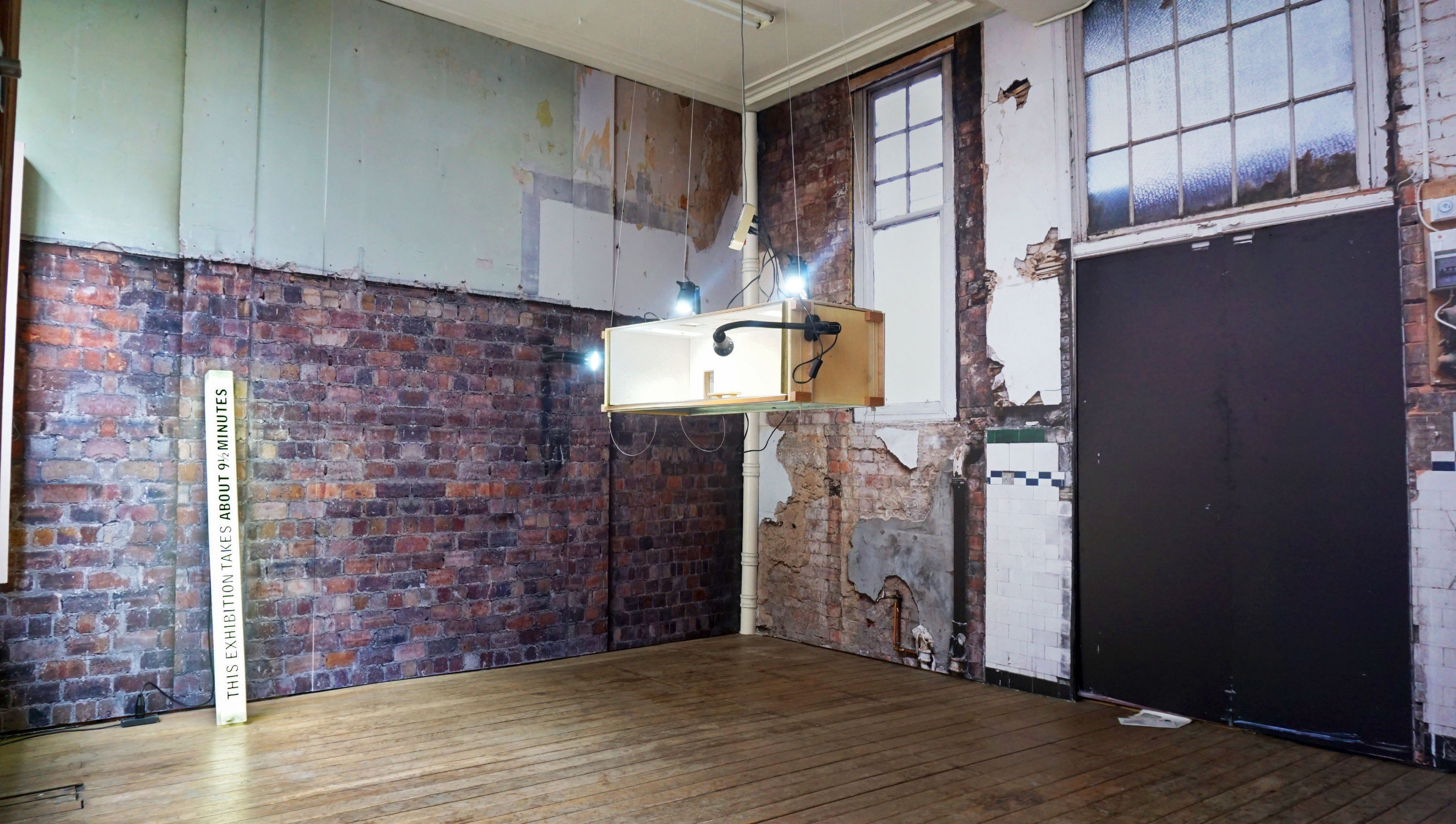 The last few times I visited The Brick Space it was evening; the street was dark, light shining from the interior of the space through the two windows on either side of the entrance. Peeping through them, my gaze struck those fake brick walls. Exhibition #16 consisted of a screening: Hitchcock’s brick-rich Rear Window projected onto The Brick Space’s scenery of printed bricks. Rear Window is all about peering out from within the confines of Jimmy Stewart’s apartment at the brick walls of the neighboring buildings and the worlds that unfold behind them. If, like Stewart's telescope, The Brick Space’s street-facing windows are pointing out, then the image projected onto its retinas is that of the Aird’s Lane Bricks Space. The glassy lenses take in the Glaswegian gallery and, in a camera obscura-like twist, let it fall onto ...ism’s walls, turning upside-down both the original Bricks Space and the host-space.