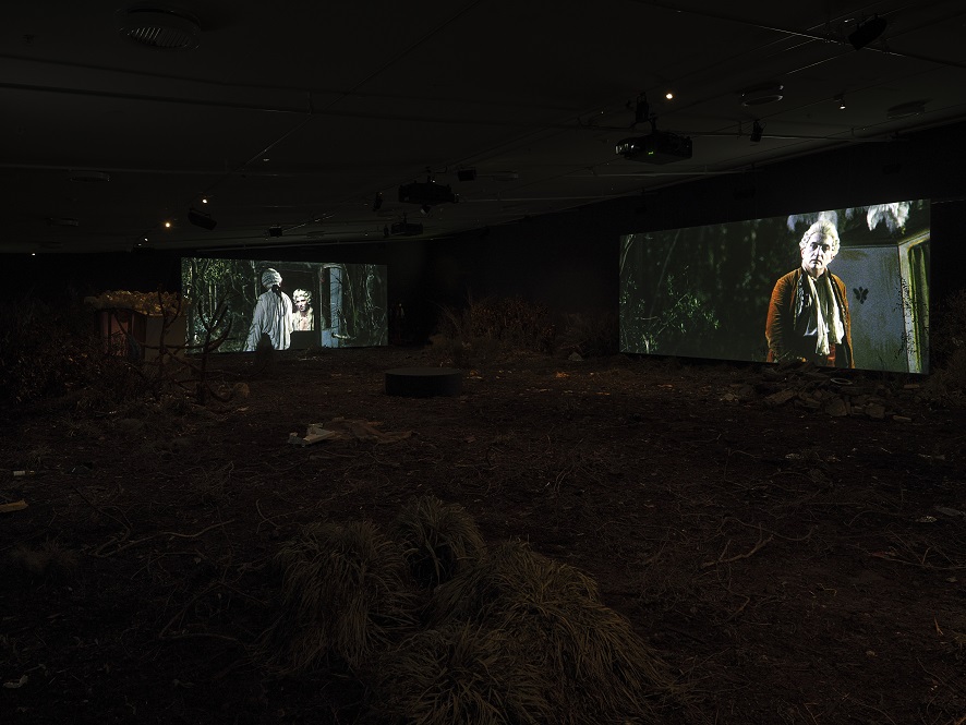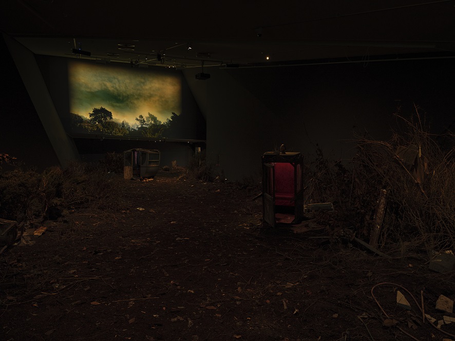 The exhibition indeed goes to great lengths to produce a world of immersion—with the trucked in tons of dirt, the real garbage and real trees in the service of an all-encompassing sensorium. Even a scent designed especially for Liberté, a sort of a body-meets-earth-meets-Comme des Garçons, is piped into the space to transport us by piquing yet another sense. However, it is through the gaps or ruptures in the smooth surface of immersion that the work opens up to let us in and to reveal its own construction. In Serra’s films and especially in Liberté, the gaps—between the scene and the stage, the artificial and the real—become questions that are central to understanding the work as a whole.