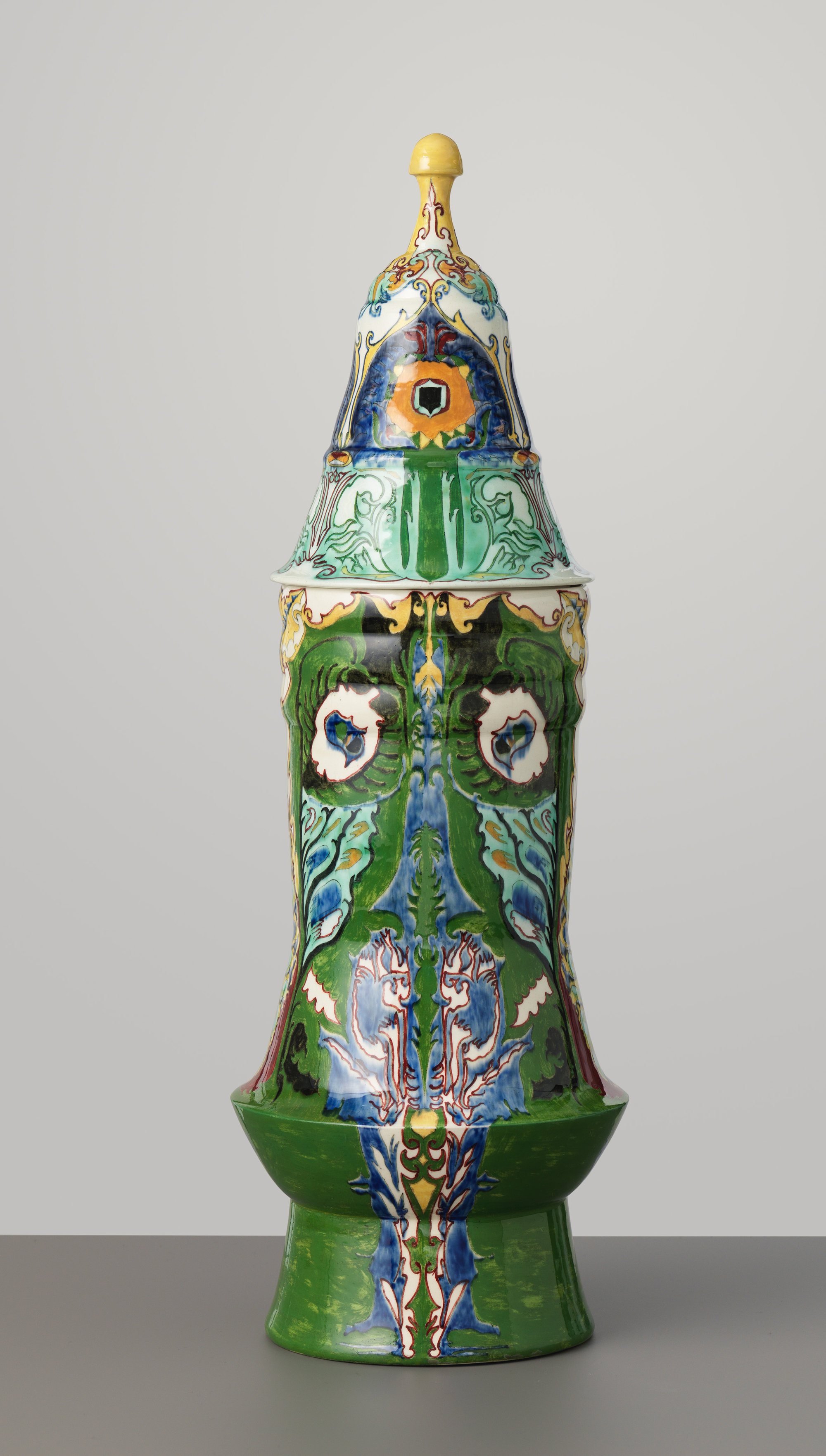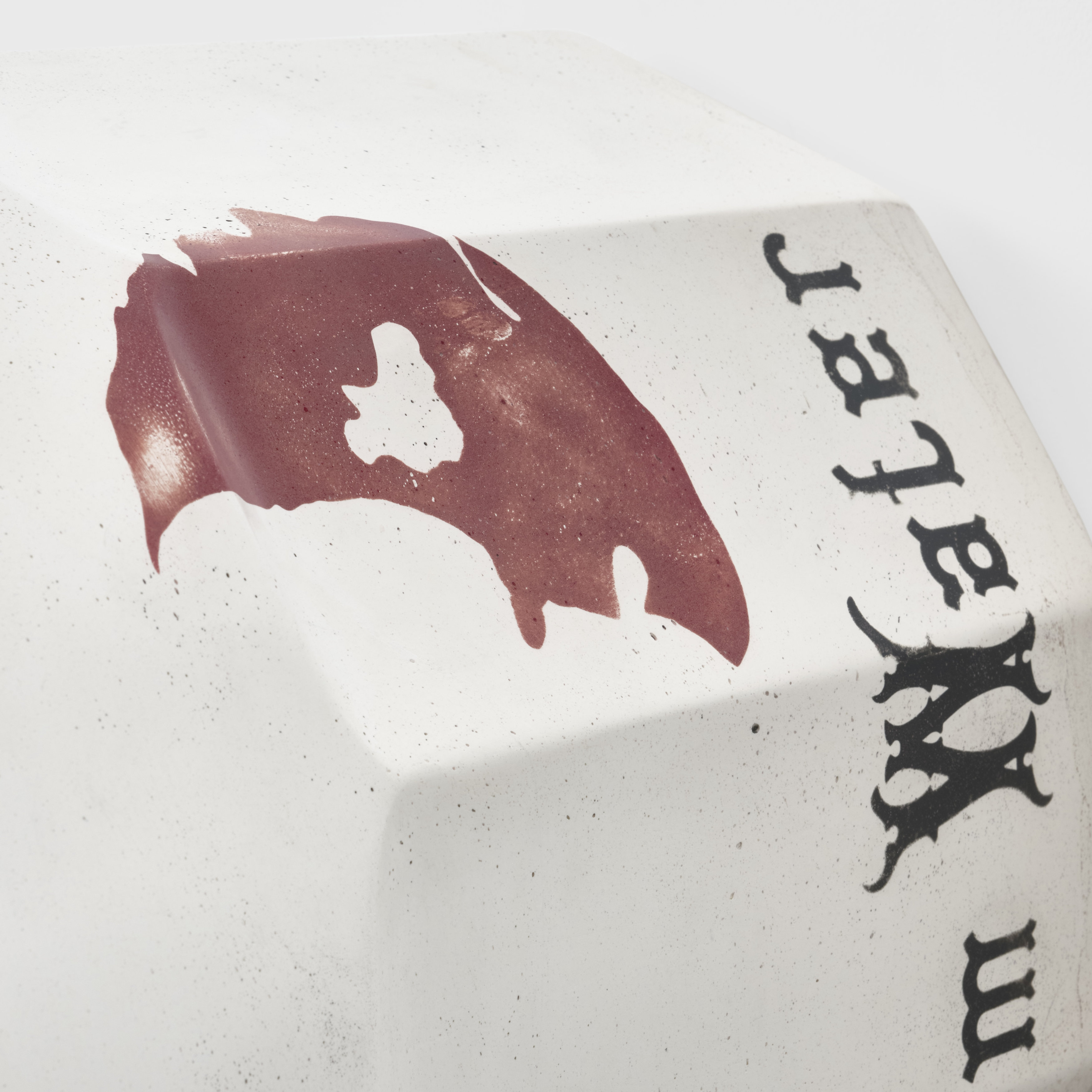 I was therefore pleasantly surprised to encounter some unexpected atmospherics at KM21. In “Parallel Bones” recent work by Reus is shown alongside selections the artist made from the Kunstmuseum Den Haag’s expansive collection of objects from T.A.C. Colenbrander, a Dutch Art Nouveau designer and ceramist. The gallery is dimly lit and moody, the air strangely warm and a little stagnant. This setting lends the exhibition — laid out like a palindrome with a pair of Reus’ “Candlesticks” (2022) placed on either end of the gallery bracketing more than fifty sculptures, textiles and ceramic accoutrement — a somewhat undisciplined sensuality in which details and contours from individual works are reflected across the walls as overlapping, marbled shadows. With their traces of jam and yogurt rendered in epoxy resin, the “Clementine,” series, which takes up the majority of space in the gallery’s mid-section, were the main conduits of this shadowplay, and showcased a painterly detail that almost outshines the jumble of decals and inscriptions populating the surface of the jars.