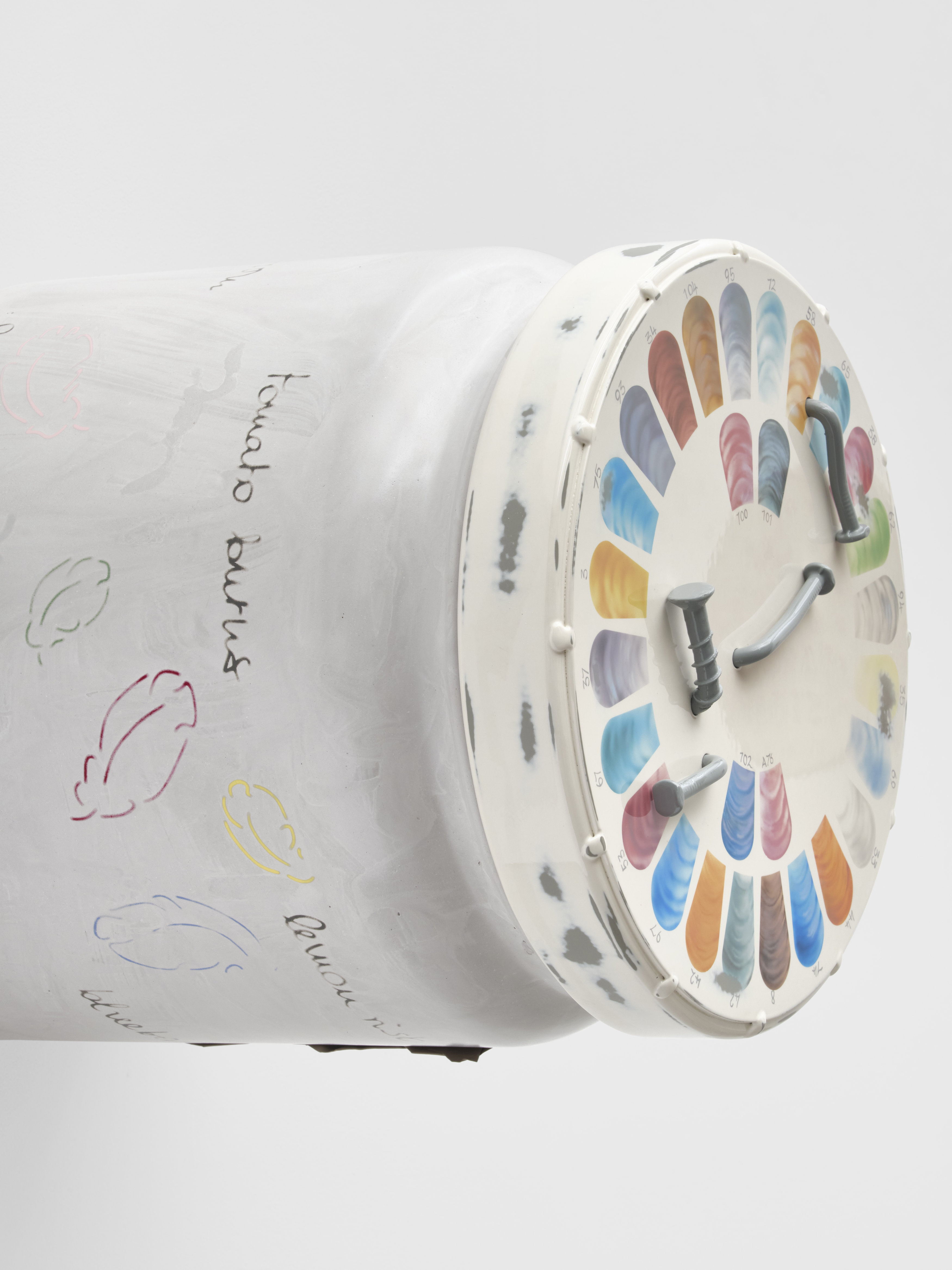 Take ” Candlesticks,” which are tall, slender lampposts made from powder-coated aluminium and “hand-patinated” brass, featuring a crown of moulded resin wreathed by aluminium wires. Somewhere in the list of material processes, the posts became a handsome forest green, which together with its sceptre-like crown and wires evinces a grandiosity and formidability. A sculpted object made of resin and white plaster in the base of each lamp undercuts this majesty, however: variations include an ear of corn, an aubergine, a clutch of mushrooms, and a bulbous raspberry, each perched atop a base resembling a paper plate. Are these the discrete elements of a picnic? An energy source? A visual gag? A bit of “lightness” for a lamp with no electrical capabilities? In fact an assortment of visual clues leads to a more literal reading in which the wires of the lamp's crown appear to spell out “LED” and “Halogen”, while engravings on the base of the post and inlaid bits of measuring tape signal a laboratory of sorts. The introduction of numbers and signs rebukes our marveling at this glamorous object, reminding us that this work is serious, it’s about something, it’s about agribusiness, but it’s also about art-making, which is perhaps not all that serious.