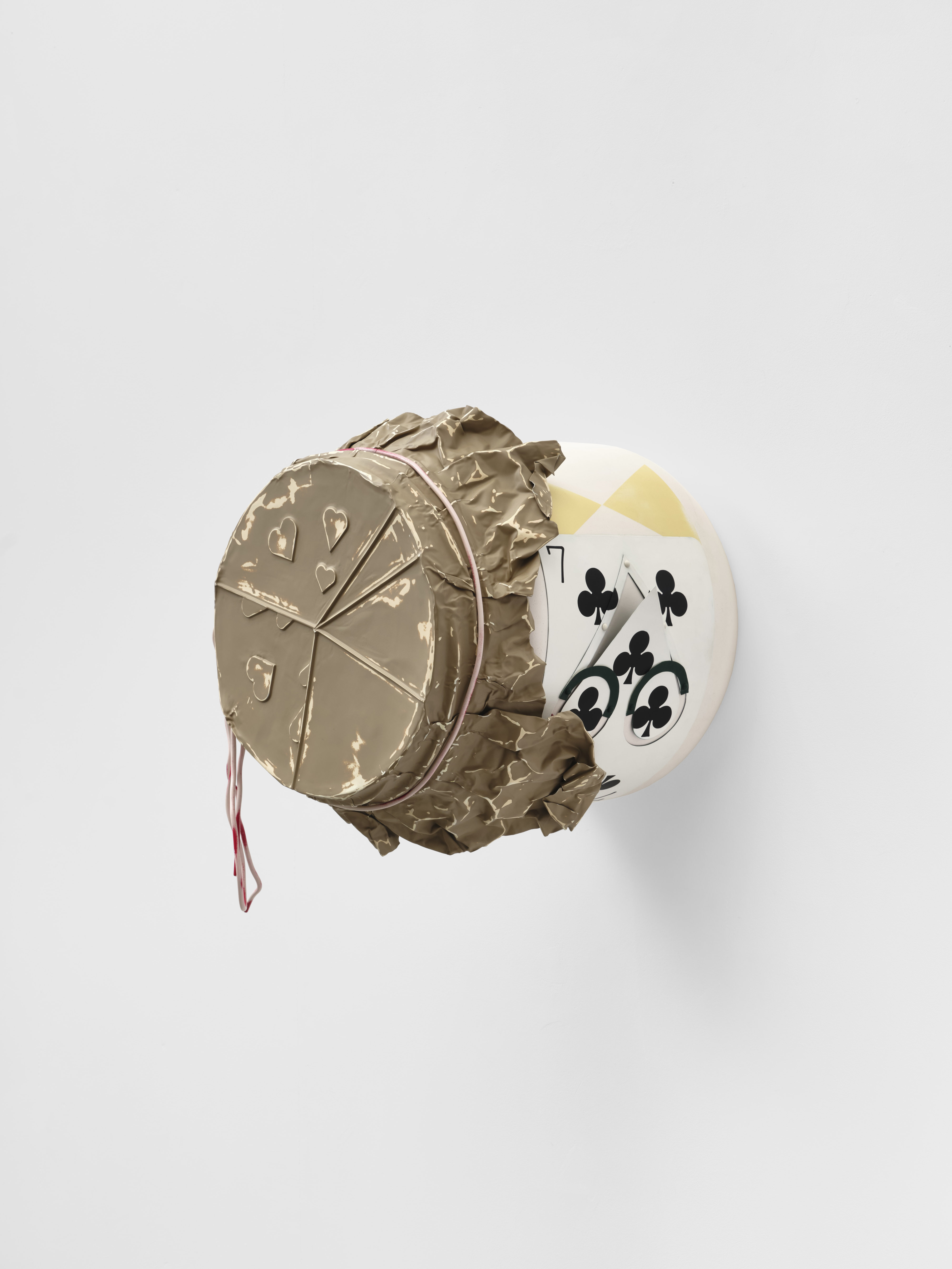 Whenever I see the work of Magali Reus, I think of Matthew Barney. While Barney has recently started working with gold, brass and terracotta, and Reus has continued to employ rubber, powder coating, laser-cut aluminium and hand-painted plaster, both artists celebrate the malleability of their materials, coaxing hard metals into soft curves. The resulting sculptures refer to new systems of meaning — sometimes mythological, sometimes mundane. And yet, a niggling sense that we’ve missed part of the action is a common effect of Reus’ work. What’s left is beautiful, staged detritus: a large, wall-bound padlock, broken (” Leaves,” 2015), a gigantic assemblage that looks like a jungle gym or defunct circuit board (“HWAEL,” 2017). Barney’s sculptures, on the other hand, are more overtly interwoven with the stories (however convoluted) and worlds of his Gesamtkunstwerke. “The video work is a means to a sculptural end,” he said in a recent interview.¹ A six-hour excrement-anointed wake for Norman Mailer (River of Fundament, 2014) seems like an extravagantly expensive excuse to make props for exhibition, but there is something special about the way Barney’s sculptures function as separate yet dependent excerpts of a larger story. I remember seeing props from The Cremaster Cycle (1994-2002) at the Walker Art Center two decades ago. Distanced from the films’ bombastic, self-serious and interminable frames, they felt unburdened — almost whimsical. An upside-down saddle encrusted in mirrored tiles spun languidly, as if just dismounted.