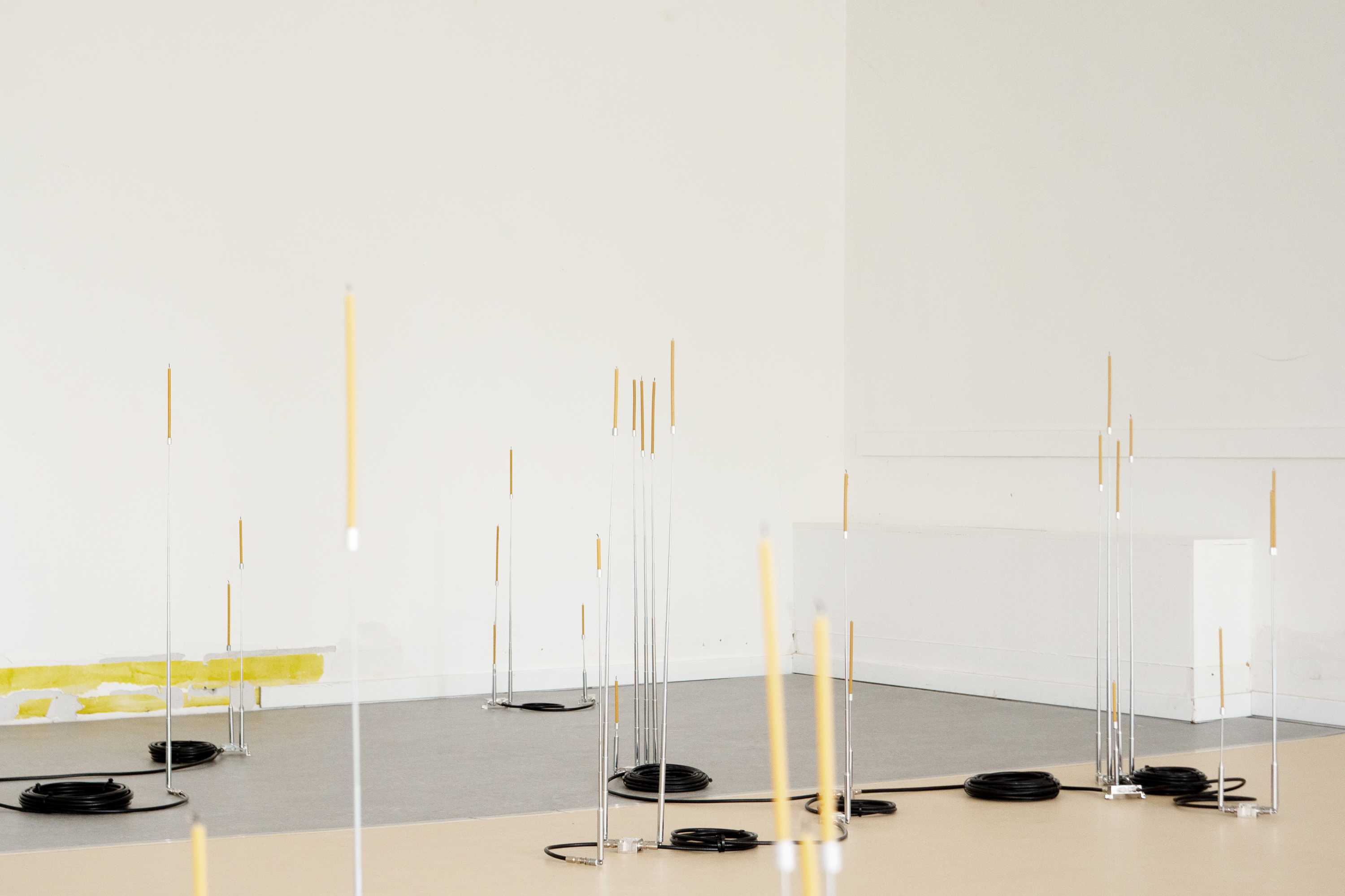 The remainder of the second floor is occupied by Candelabras (mesh), a networked composition of neatly coiled coaxial cables that sprawl across the floor, connected and spliced together via splitters on which are mounted delicate telescoping antennas topped with thin, unlit, ochre candles. The low forest of unpowered communications infrastructure hovers around a yawning rail-less chasm, at the bottom of which I see Fixture tirelessly circulating air—a breeze that will never reach this upper landing (yet did it somehow blow out these candles?). The structural and material choices of Candelabras (mesh) clearly reference the simple branching, looping, or repeating logics that animated Fluxus performances and early media art. Yet this reading is ultimately denied by the work’s obdurate silence and inactivity. I notice the blackened wicks and varying candle heights evidence another kind of energy. The work darkens into an opaque afterimage of possible transmissions, seances, memorials, communal meals—a sociality now evacuated or placed on indefinite hold.