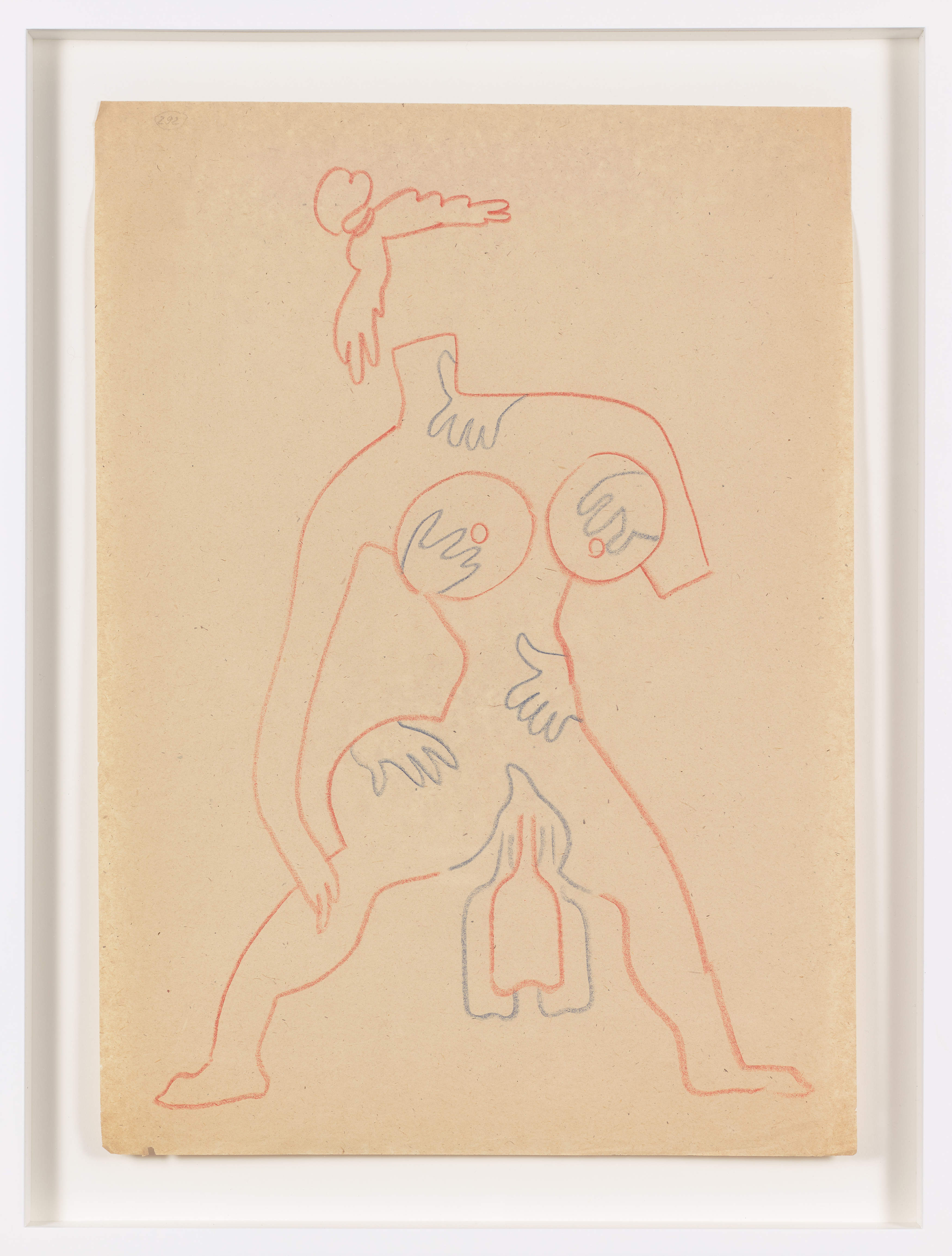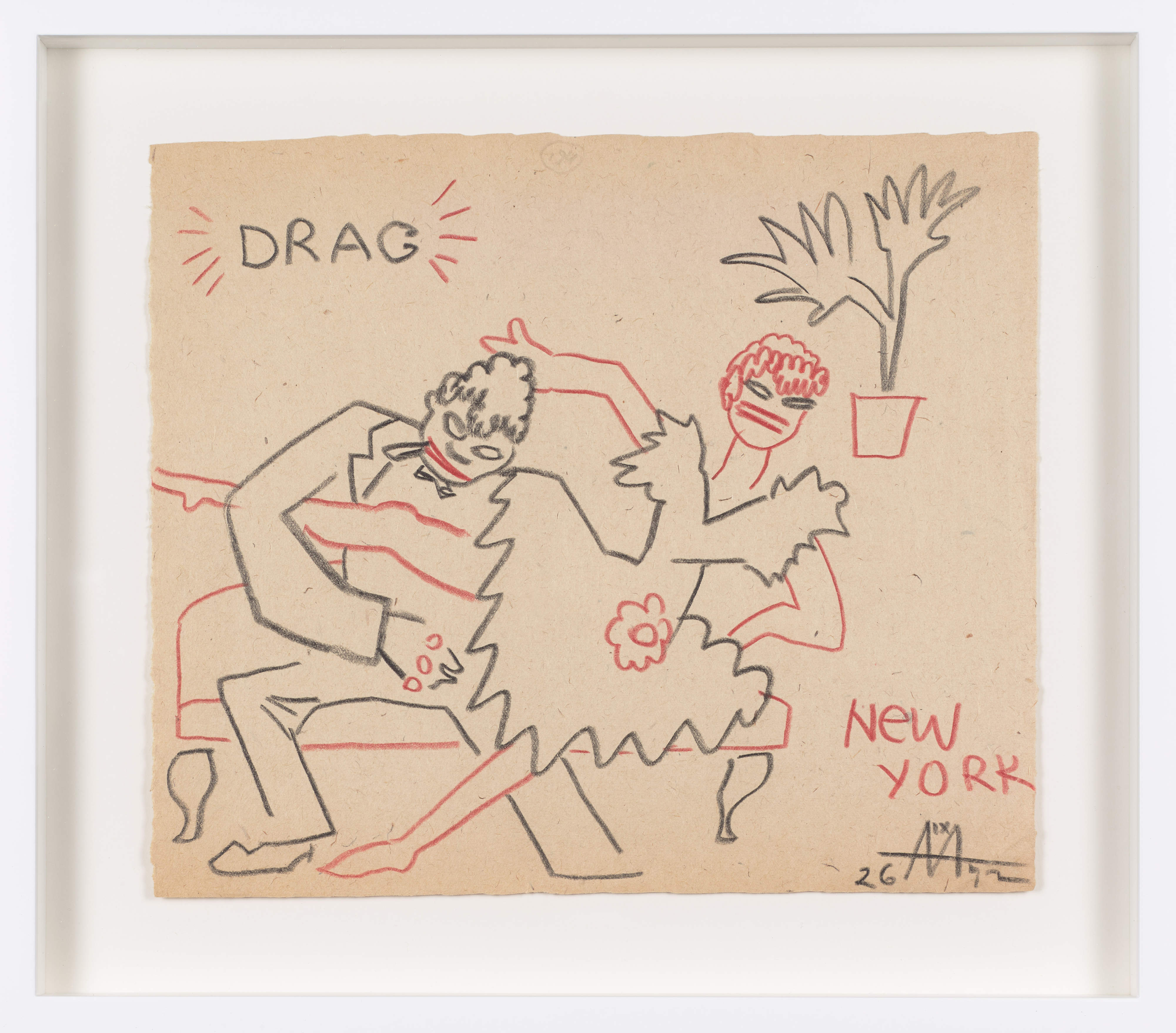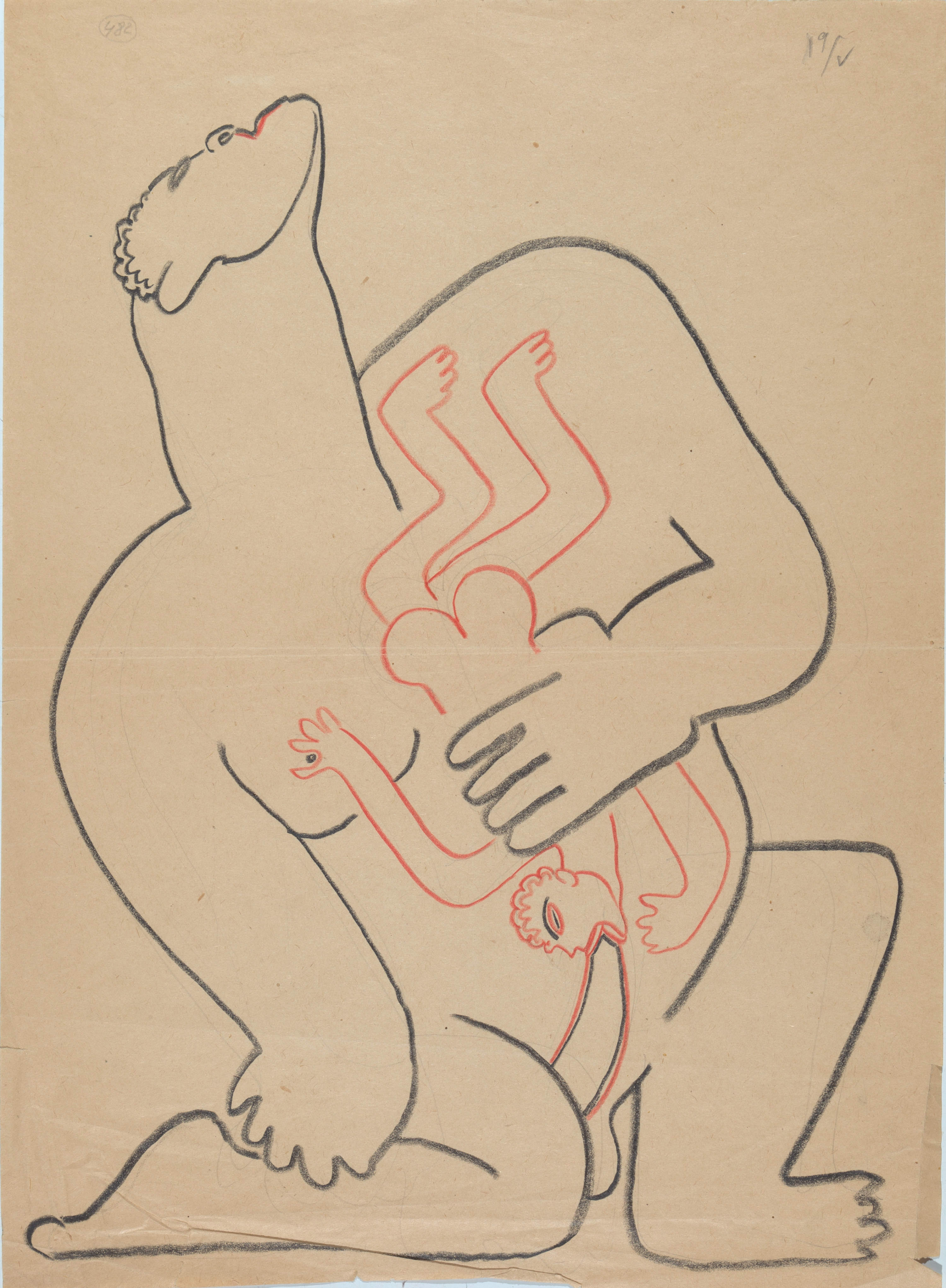 Sex drawings. Lots and lots of sex, in drawings on paper. A huge chunky guy with a thick, stretched-out neck holding a tiny figure, the size of his arm, upside down so they can suck his cock. Busty lady fucking a tree, various animate branches doing different kinds of pleasuring work on different parts of her body. Orgies. A scene from a drag show in New York. A languishing post-coital embrace on a bed with checkered sheets. Men with red lipstick. Men in uniform. Men taking their uniforms off and getting down to business. Animals. Including rams wearing masks with big erect cocks for noses. A naked person lies back with legs spread wide open, inviting one of the newly endowed masked rams in.