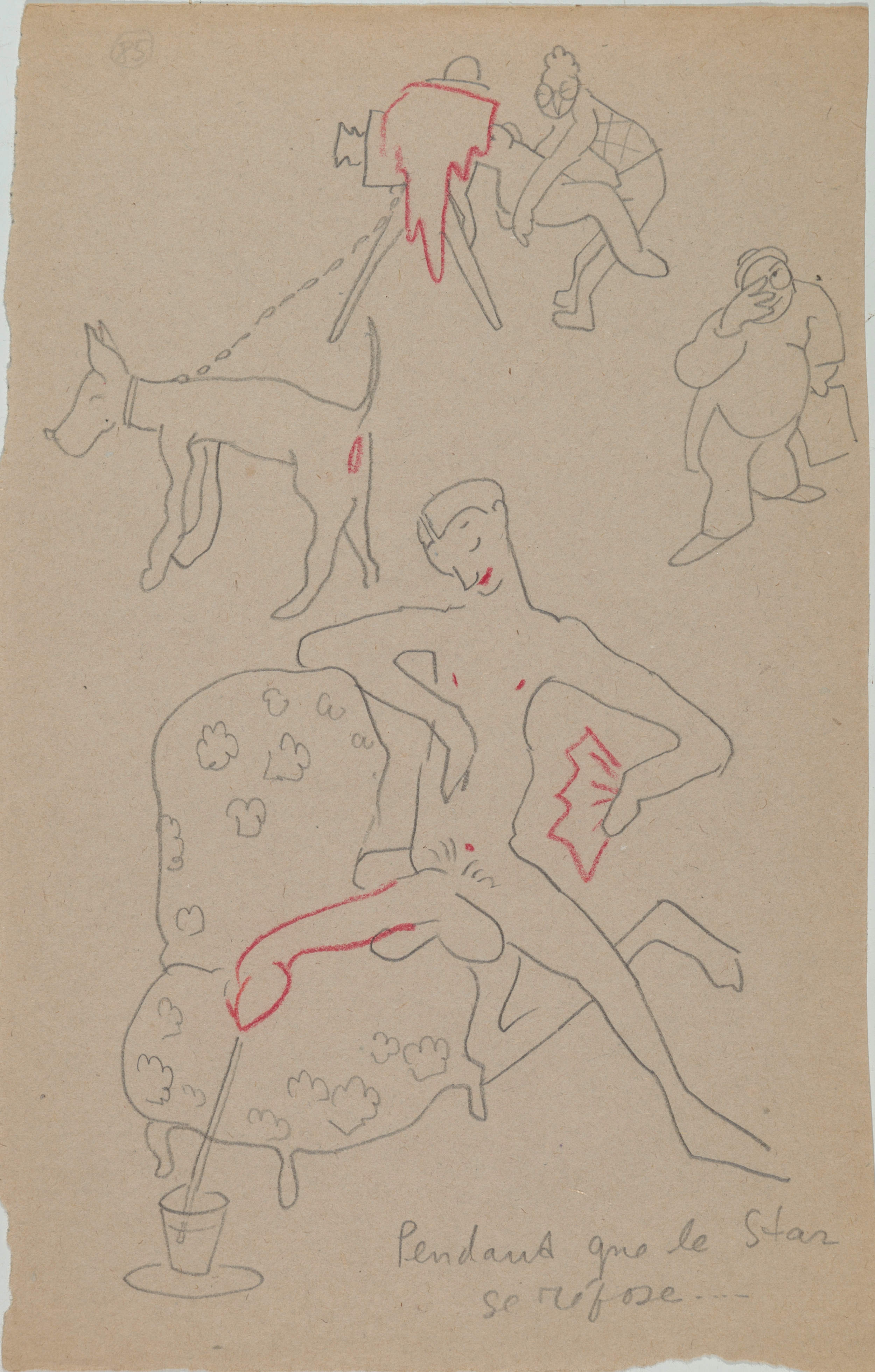 Cocks are energetic entities up to all sorts of things. Some of them have faces or little arms or legs of their own. One is covered in stars and walking a tightrope at the circus (the tightrope itself is suspended between two erect cocks). There are scenes from pornographic film sets in the interwar years: a red-lipped performer is taking a break between scenes, fanning off to cool down, their enormous red cock sipping from a glass of water with a straw. Gotta stay hydrated. Someone else is on set getting ready for a scene, powdering his nose, while two assistants are kneeling at his feet; one polishing his boots, the other polishing the head of his cock.