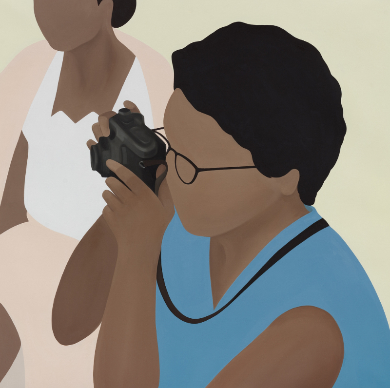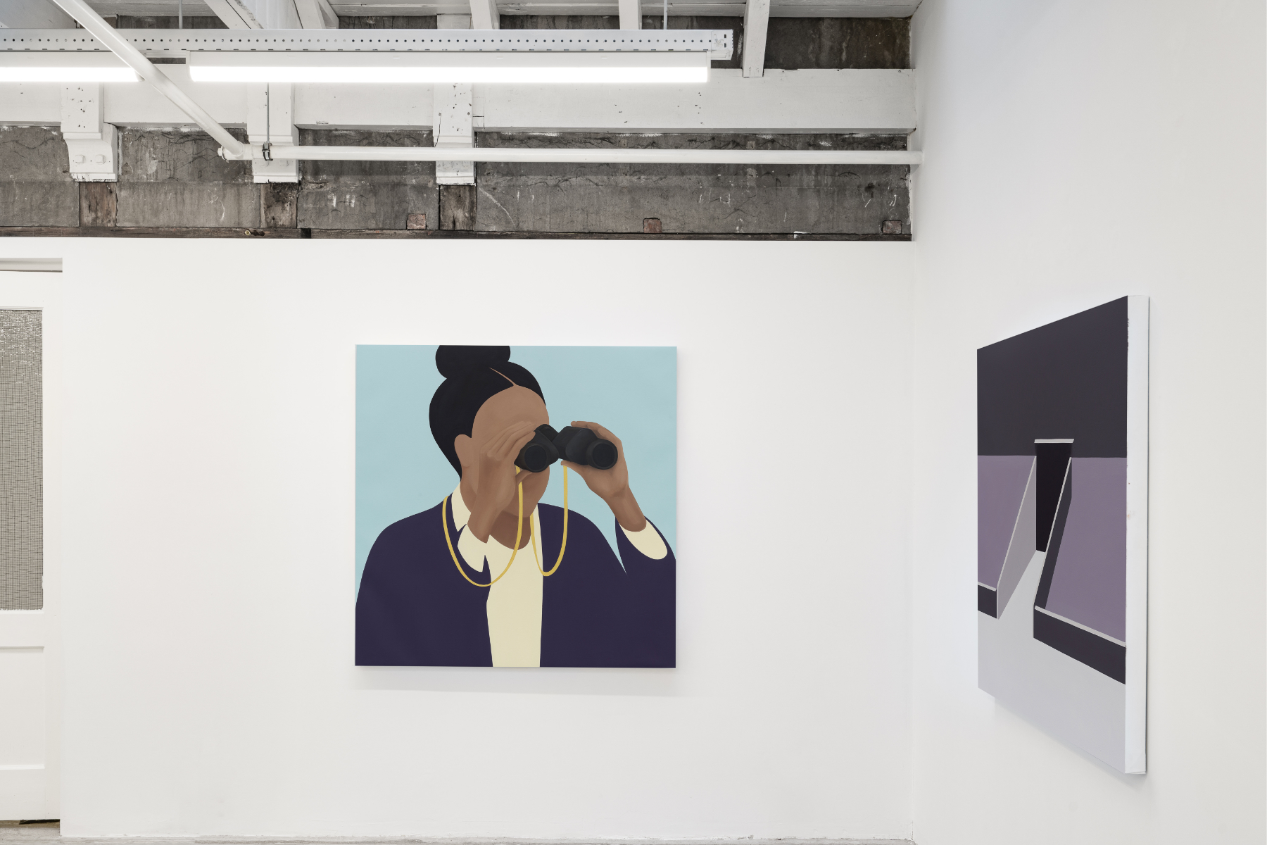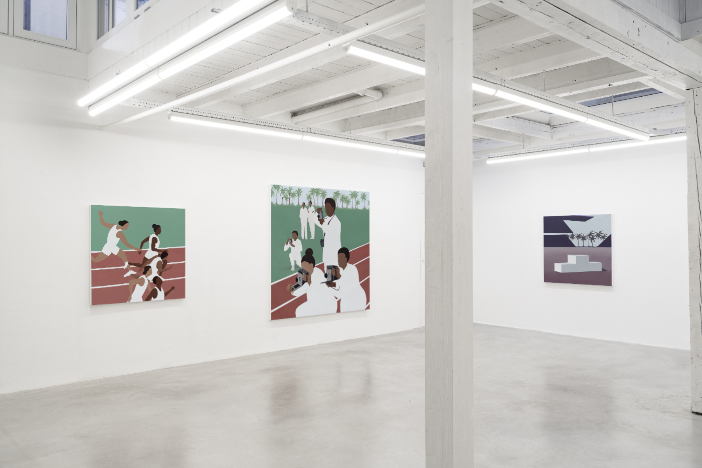 Many of Nkosi’s athletics paintings, with their movement between the specific and the generic, the intimate and the collective, act like history paintings, though of an indeterminate time and place. This indeterminacy primarily arises from the occlusion of identifying facial features, which render subjects akin to a piece of honed material like a tumbled stone or a fleshy flower petal. Especially in the vacant, textured faces of her subjects, Nkosi creates an anti-iconographic iconography — distinct yet reproducible — that reappears again and again in similar forms with human subjects as well as in architectural elements. Passage reduces a darkened stadium tunnel and surrounding grandstand into a geometric composition in lilac and aubergine, as if an attenuated excerpt of one of Bridget Riley’s whirling grids. The discrete shapes and lines offer a rudimentary demonstration of how the gaze might be funneled towards a point of interest in the surrounding paintings, many of which are larger and more explicitly narrative driven.
